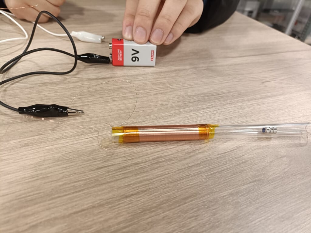 コイルをプラスチックチューブに巻いて電流を流すと、中の磁石がスーーーッと動き出す!?
