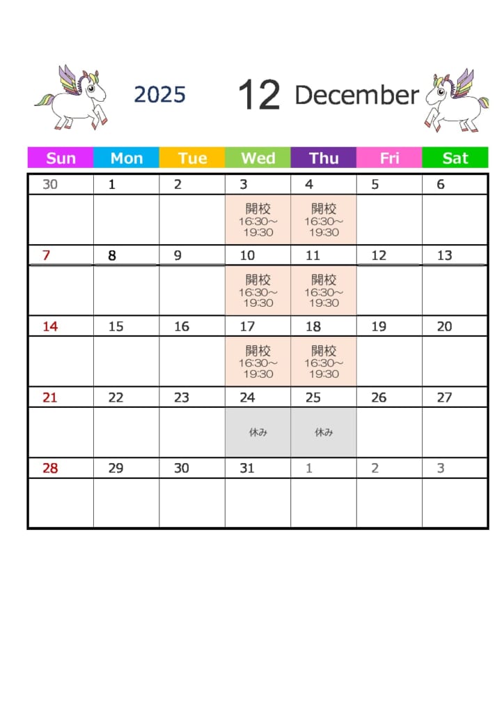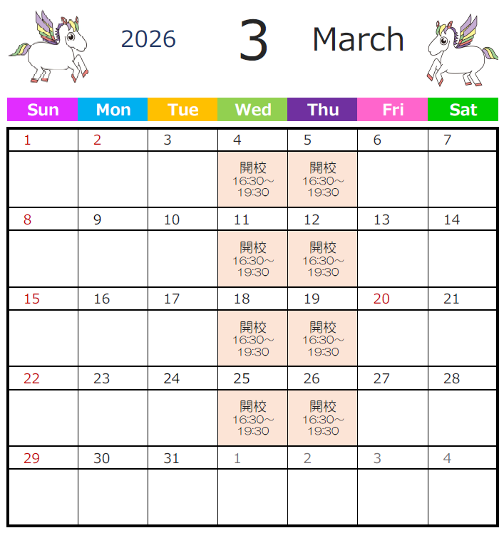 開校曜日:毎週水曜日・木曜日(祝日はお休みします)