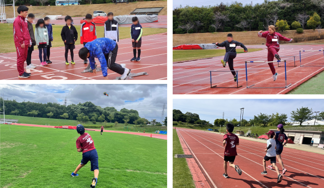 《 練習例 》スタブロを使用した練習、ハードルドリル、50m~200mの走練習、ラダー、バウンディング、跳躍練習、投てき練習、リレー などを行います。