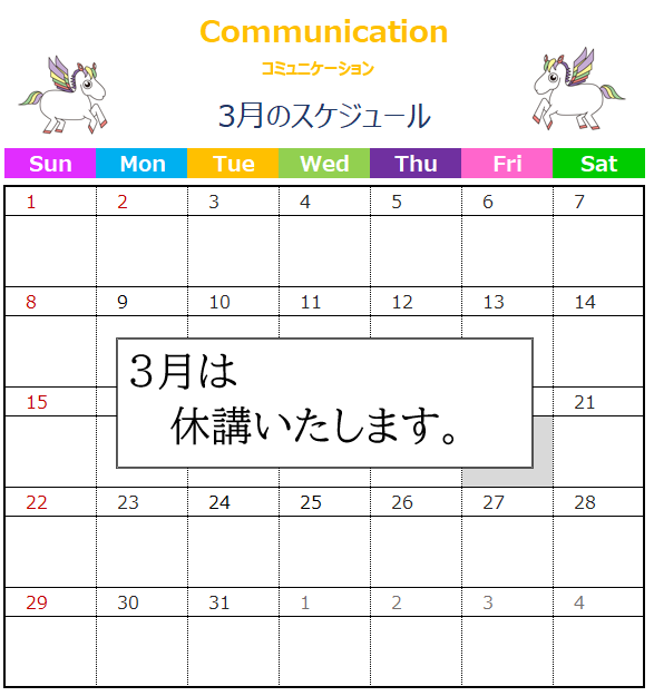 3月のお申し込み ⇒ 講師が留学などの長期不在の為、3月は休講といたします。